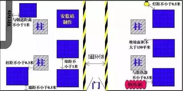 物品堆垛與堆垛之間的距離不小于1米?!秱}儲場所消防安全管理通則》(GA1131-2014)6.8