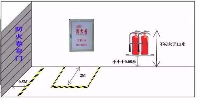 防火卷簾門兩側各0.5m范圍內(nèi)不得堆放物品,并應用黃色標識線劃定范圍?!度藛T密集場所消防安全管理》(GA654-2006)8.3.7