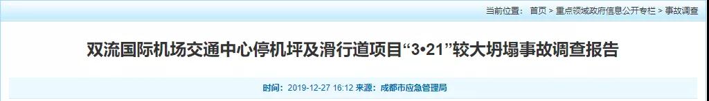 經(jīng)調(diào)查認(rèn)定,雙流國際機場交通中心停機坪及滑行道項目“3·21”坍塌事故是一起生產(chǎn)安全責(zé)任事故,事故等級為較大事故。