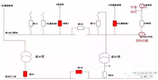 事發(fā)項(xiàng)目為某公司110千伏某變電站110千伏配電裝置改造,改造內(nèi)容為更換110千伏室內(nèi)敞開式手車斷路器,施工中標(biāo)單位為某集團(tuán)有限公司電力安裝分公司(省管產(chǎn)業(yè)單位,簡(jiǎn)稱“安裝分公司”)。為不影響重要用戶供電,改造期間變電站采用Ⅰ紅旗省府線直接串帶省1#變、Ⅱ鳳省線直接串帶省2#變的過(guò)渡方式運(yùn)行。6月12日改造完成后,110千伏母線恢復(fù)運(yùn)行。(運(yùn)行方式見(jiàn)圖1、圖2)