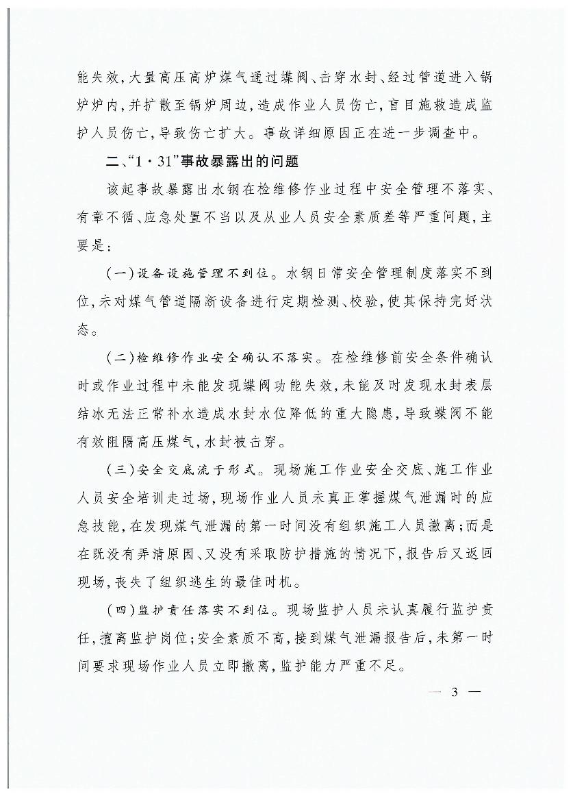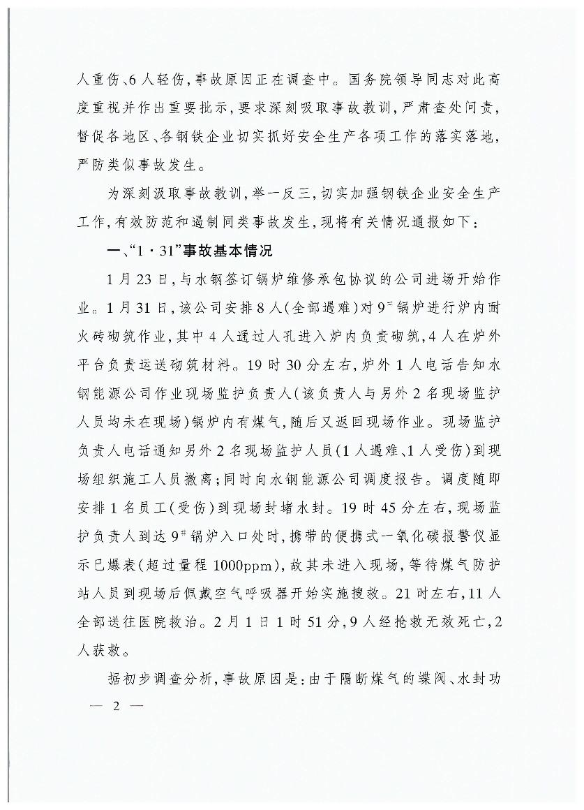 貴州首鋼水城鋼鐵(集團)有限責任公司“1?31”煤氣中毒等兩起較大事故的通報