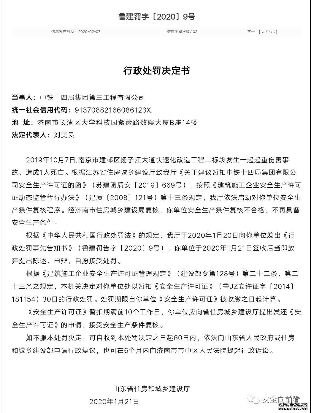 省住房城鄉(xiāng)建設(shè)廳魯建罰字〔2020〕9號(hào)行政處罰決定書(shū)顯示,2019年10月7日,南京市建鄴區(qū)揚(yáng)子江大道快速化改造工程二標(biāo)段發(fā)生一起起重傷害事故,造成1人死亡。根據(jù)江蘇省住房城鄉(xiāng)建設(shè)廳致我廳《關(guān)于建議暫扣中鐵十四局集團(tuán)有限公司安全生產(chǎn)許可證的函》(蘇建函質(zhì)安〔2019〕669號(hào)),按照《建筑施工企業(yè)安全生產(chǎn)許可證動(dòng)態(tài)監(jiān)管暫行辦法》(建質(zhì)〔2008〕121號(hào))第十三條規(guī)定,我廳依法啟動(dòng)對(duì)中鐵十四局三公司安全生產(chǎn)條件復(fù)核程序。