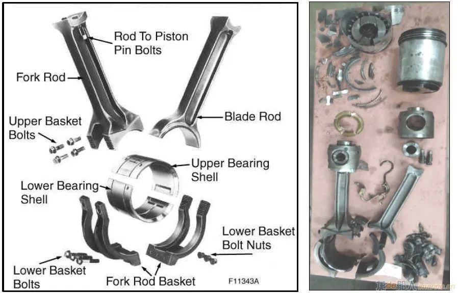 在檢查中,工程師發(fā)現(xiàn)6號(hào)曲柄銷(用于6號(hào)和14號(hào)氣缸)的連桿和活塞處于“完全損壞狀態(tài)”。在油底殼中發(fā)現(xiàn)曲柄總成托架的一個(gè)完整螺栓,同時(shí)在另外一處發(fā)現(xiàn)了緊固螺母,這證明螺栓和螺母是在運(yùn)行過(guò)程中脫落的。總成的其他螺栓均由于拉伸過(guò)度而發(fā)生變形及斷裂。