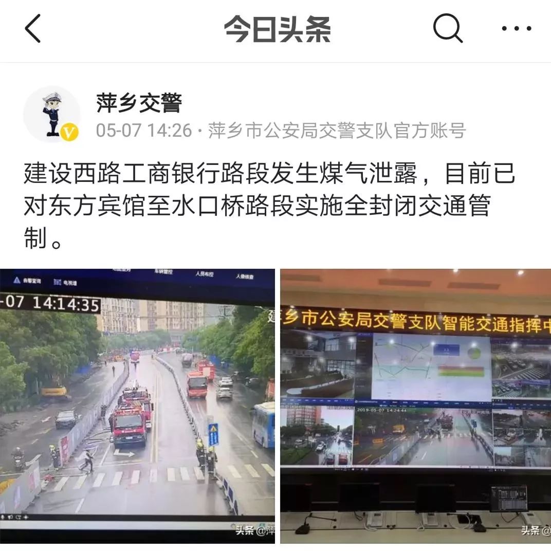 5月7日下午14時09分,萍鄉(xiāng)交警支隊指揮中心接到消防支隊119電話,在建設西路工商銀行路段發(fā)生天然氣泄漏事件,請求交警增援并實施路面交通管控。