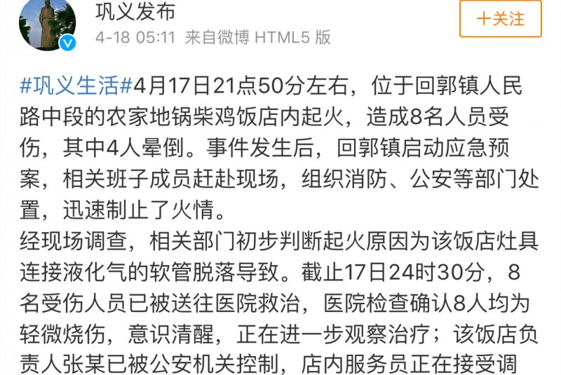 “鞏義發(fā)布”稱:4月17日21時50分左右,位于回郭鎮(zhèn)人民路中段的農(nóng)家地鍋柴雞飯店內起火,造成8名人員受傷,其中4人暈倒。事件發(fā)生后,回郭鎮(zhèn)啟動應急預案,相關班子成員趕赴現(xiàn)場,組織消防、公安、等部門處置,迅速制止了火情。