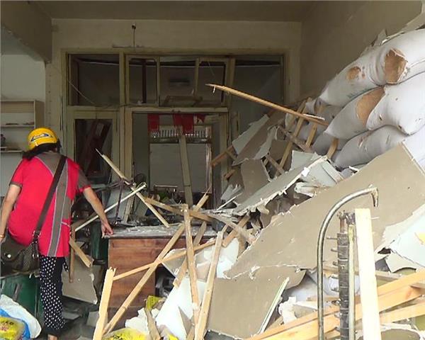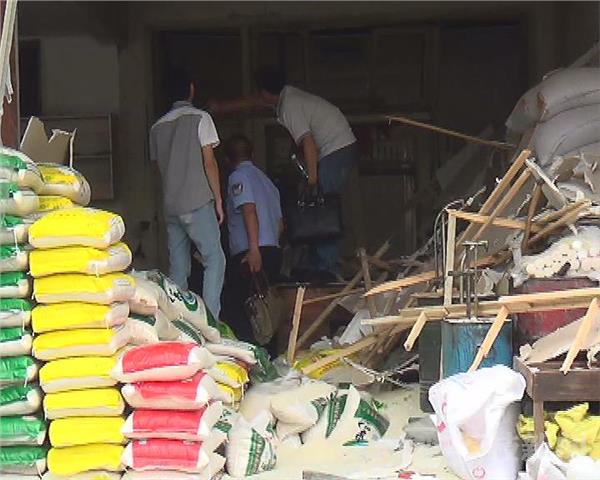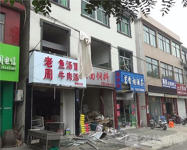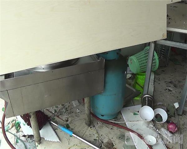 記者現(xiàn)場(chǎng)看到工人正在拆卸樓上被炸碎裂的玻璃窗戶,樓下全是窗戶玻璃碎片,爆炸的牛肉面館和隔壁的房東餃面飼料店里一片狼藉,隔壁移動(dòng)公司和一個(gè)煙酒店玻璃窗戶和門牌也被炸碎裂和損壞。記者進(jìn)入餃面店發(fā)現(xiàn),里面操作臺(tái)旁邊還有煤氣瓶,房頂砸脫落熏黑,房東房間窗戶也被炸彎曲變形,隔壁房東的店鋪里面也是狼藉一片,整袋的米和飼料包裝袋被砸損。大門也被砸壞。